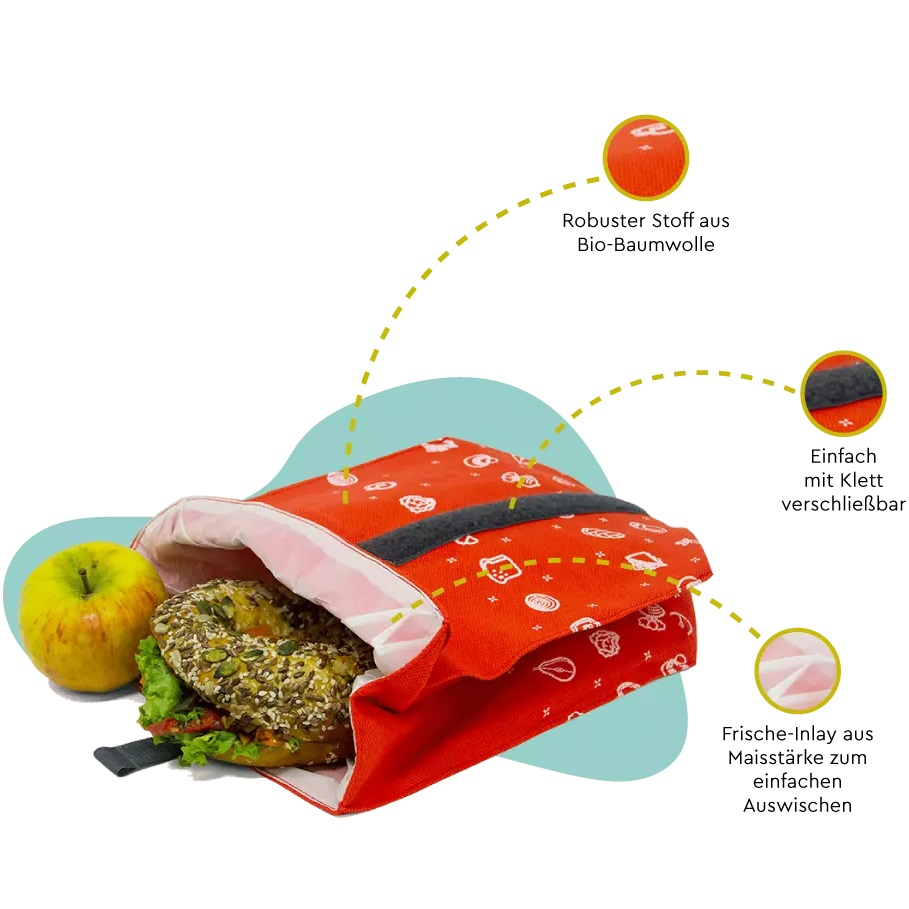 Das natürliche Inlay aus Maisstärke hält Snacks wie belegte Brötchen, Gemüse und Obst länger frisch. Nach dem Verzehr kann der Lunchbeutel mit einem Schwamm einfach ausgewischt werden. Durch sein Gewicht und sein Design ist der Beutel besonders praktisch auf Reisen und unterwegs.